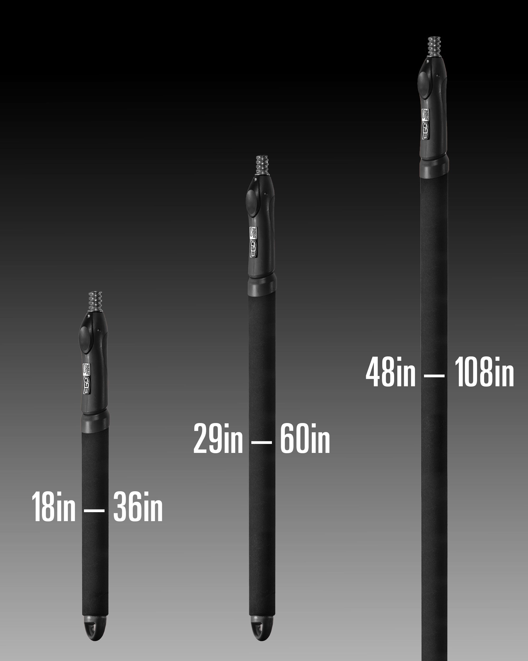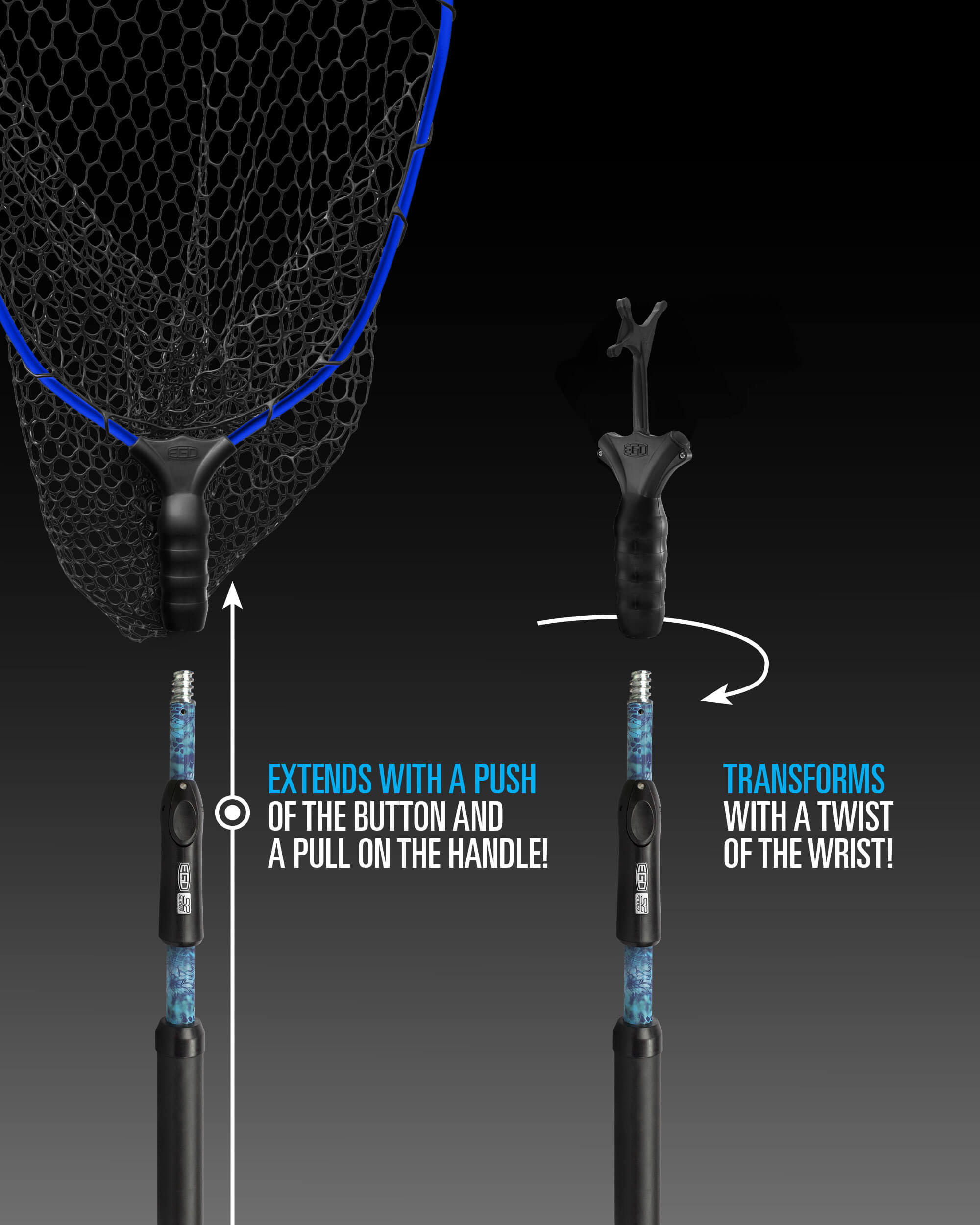 To extend the EGO S2 Slider, press and hold the black release button with your thumb and pull the foam rubber handle section. When the handle is extended to the desired length, allow the release button to seat back into the pre-set slot to lock in handle length. TO CORRECTLY LIFT HEAVIER LANDING NET LOADS, LIFT THE WEIGHT MORE VERTICALLY.